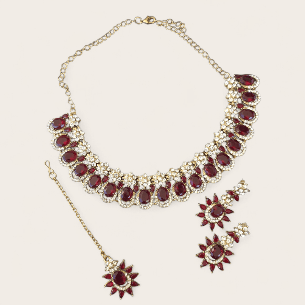 This beautiful, handmade, dress jewellery set includes a necklace, drop earrings and a sirbandi (hair accessory). The jewellery set is studded with high quality stones.