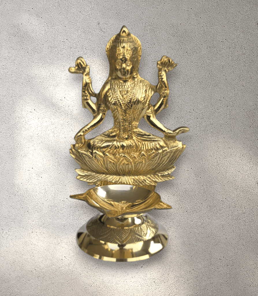 Bring divine blessings into your home with our beautifully crafted brass Lakshmi Mata with diya. Symbolising prosperity and light, this elegant piece is perfect for daily worship, festive rituals, or as a decorative addition to your altar. The intricate detailing and traditional design make it a timeless addition to your spiritual collection. Ideal for gifting or personal devotion. You can light with oil and a cotton wick.