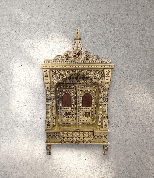 Beautiful prayer place ideal for smaller homes and apartments. This mandhir can be mounted to your wall or can be placed on top of a table, etc. This mandhir also has a convenient drawer to store your prayer essentials. This also comes with Free Delivery!