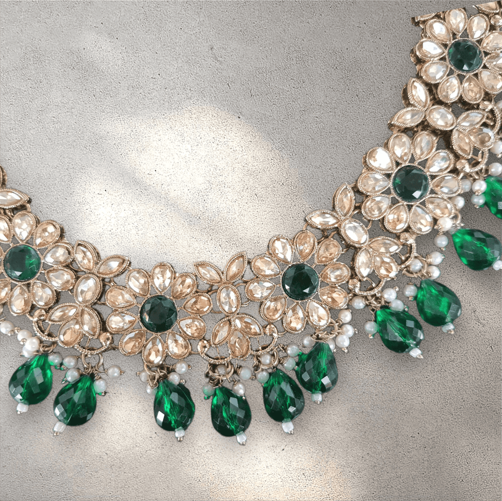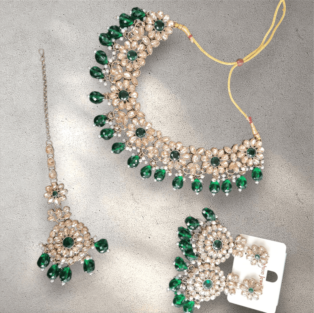 This beautiful, handmade, dress jewellery set includes a necklace and drop earrings. The jewellery set is studded with high quality stones.