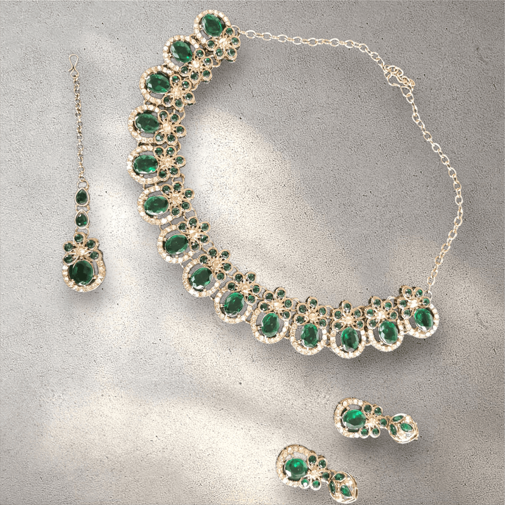 This beautiful, handmade, dress jewellery set includes a necklace, drop earrings and a sirbandi (hair accessory). The jewellery set is studded with high quality stones.