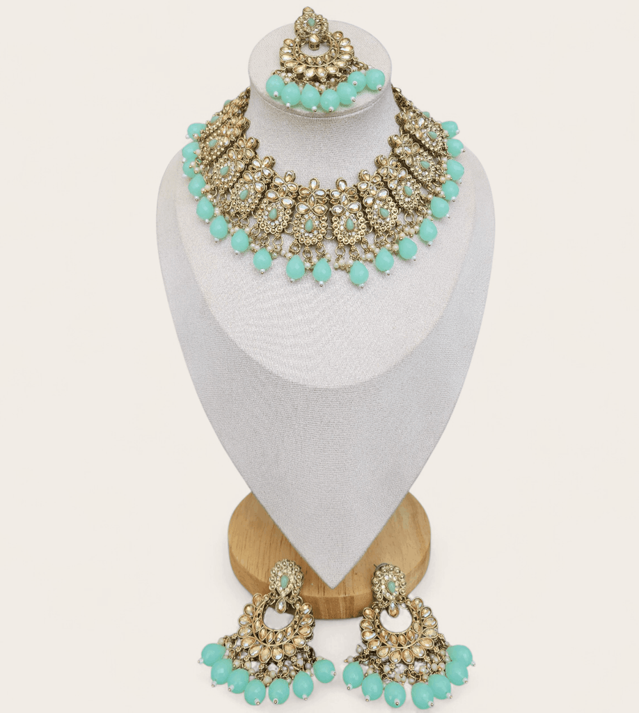 This beautiful, handmade, dress jewellery set includes a necklace, drop earrings and a sirbandi (hair accessory). The jewellery set is studded with high quality stones.