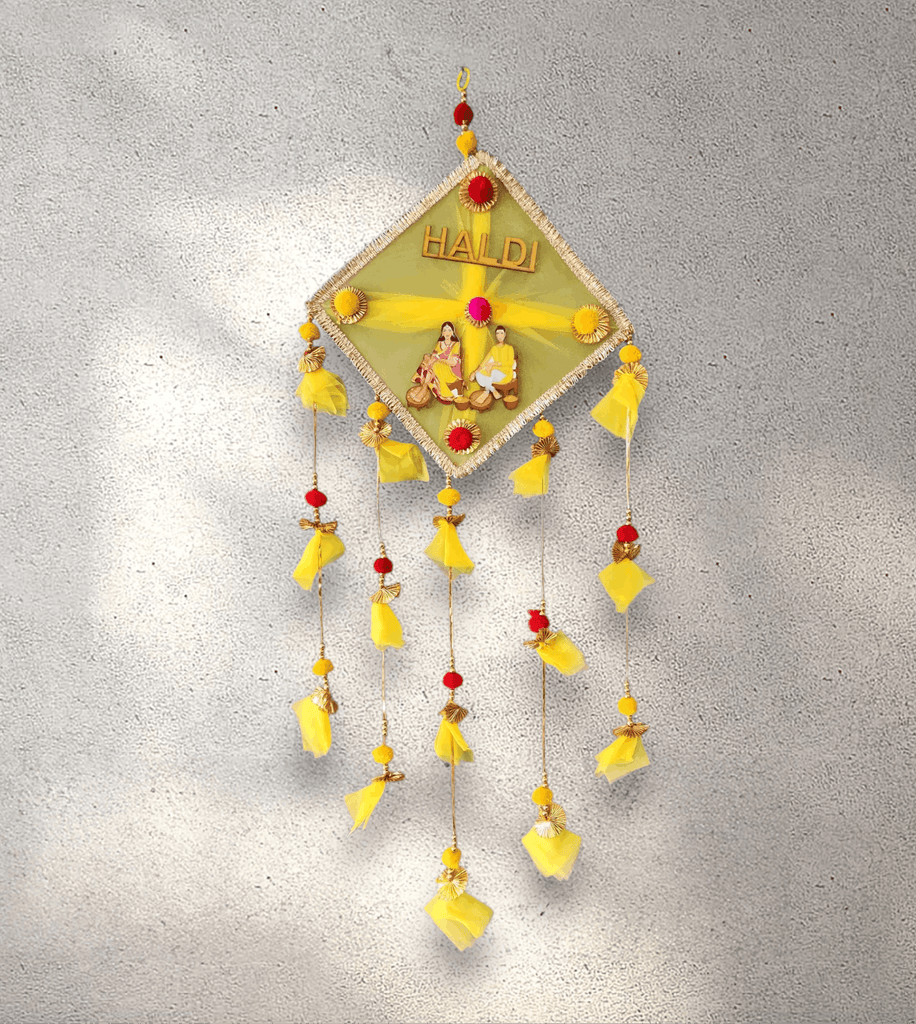 This Haldi hanging piece brings a warm, festive touch to your celebration with its vibrant yellow centre and striking gold frame. Finished with detailed tassels, it adds a lively pop of colour that beautifully reflects the joyful spirit of a Haldi ceremony. Ideal for doors, backdrops or accent decor, it instantly enhances your setup with traditional charm and elegance. A bright and meaningful addition that completes your Haldi celebration decor with style.