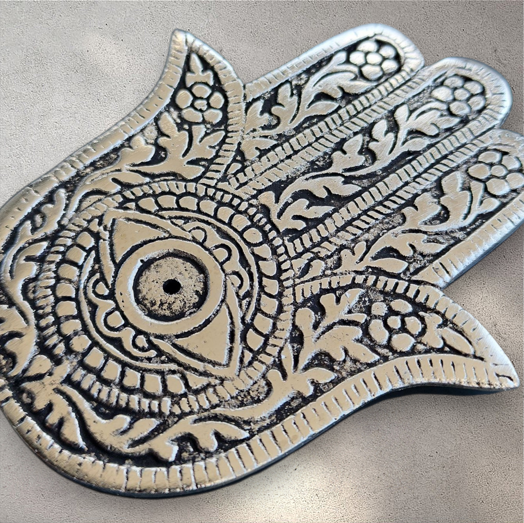 Elevate your spiritual rituals and home decor with the timeless elegance of the metal Hamsa hand incense holder. Symbolizing protection, blessings, and positive energy, this intricately designed piece serves as both a functional incense burner and a powerful talisman. Perfect for meditation spaces, altars, or as a meaningful gift, it blends tradition with artistry to create a calming, sacred atmosphere. Let the Hamsa hand bring peace, clarity, and a touch of mindful beauty into your everyday moments.- Size: Width - 12 cm, length - 10 cm, weight - 0.04 kg