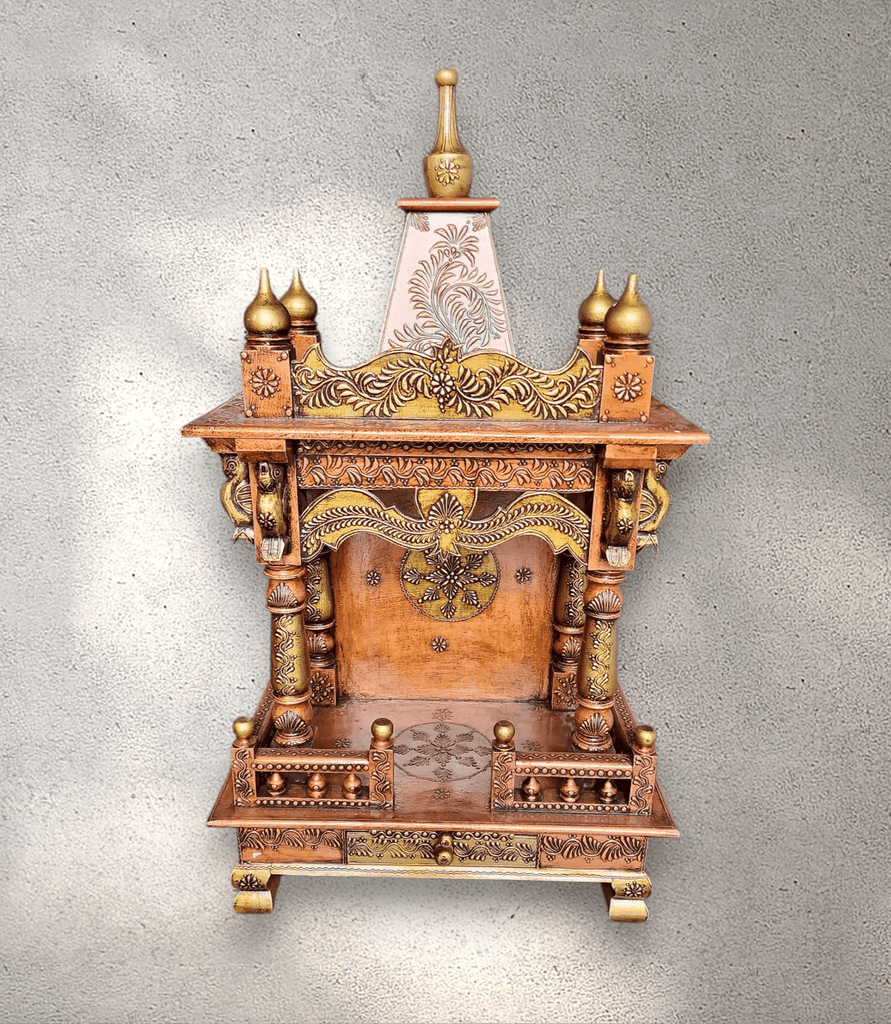 A beautifully crafted wooden mandhir designed to create a calm and sacred prayer space in your home. Detailed carvings, traditional pillars and warm wooden tones make it a timeless addition to any household. Perfect for placing your lamp, murthis and daily pooja essentials, it offers a serene and elevated space for worship, meditation and devotion. This mandhir becomes a meaningful centrepiece that enhances spiritual energy and adds elegant decor to your home. This mandhir can be mounted to your wall or can be placed on top of a table, etc. This mandhir also has a convenient drawer to store your prayer essentials. This also comes with Free Delivery!