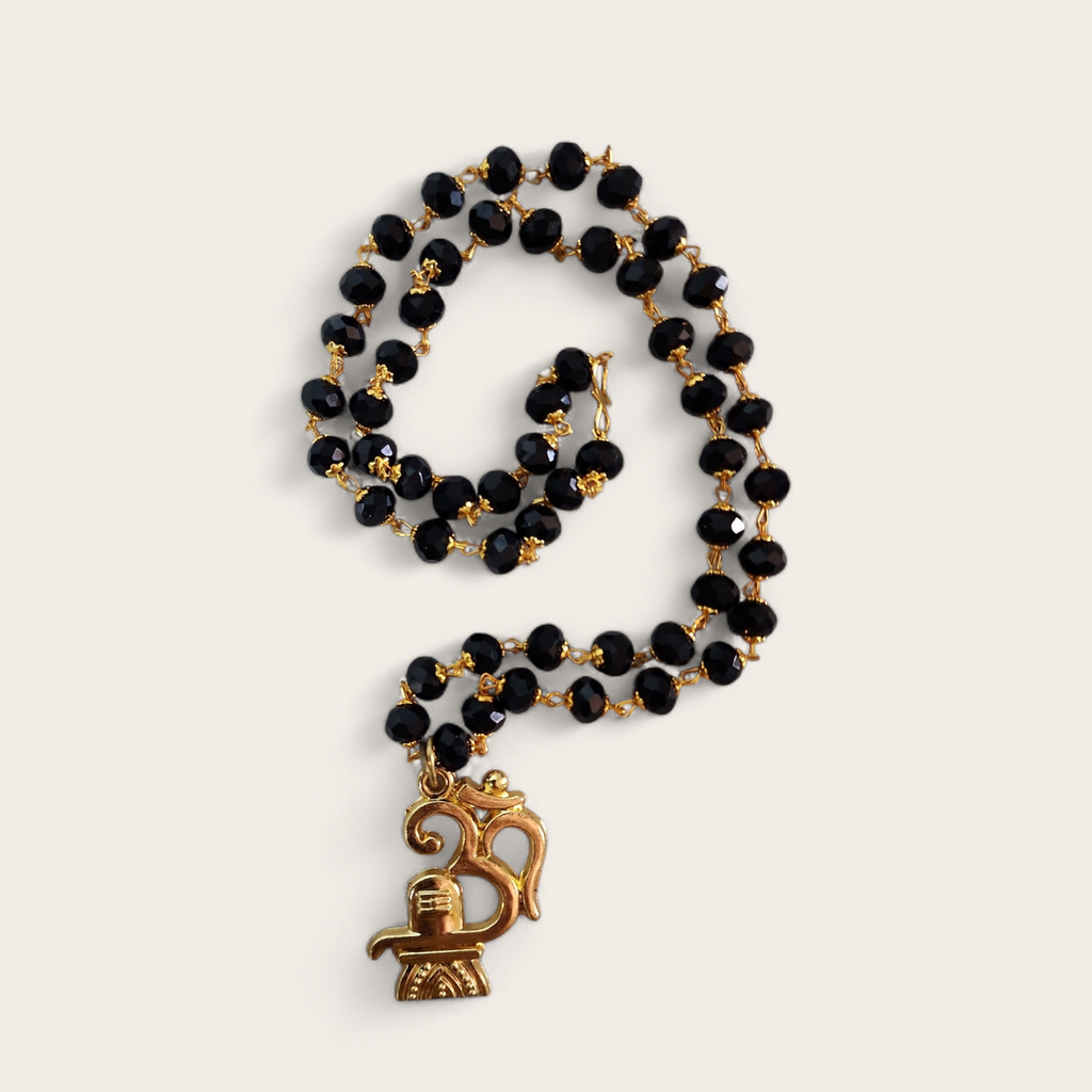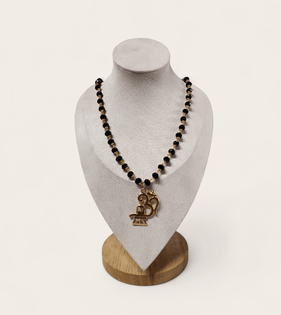 Mangal Sutra with Aum Shivling Pendant is a sacred necklace that combines traditional symbolism with spiritual meaning. The black beads of the mangal sutra represent protection, strength, and marital commitment, while the Aum Shivling pendant symbolizes Lord Shiva, divine energy, and spiritual balance.