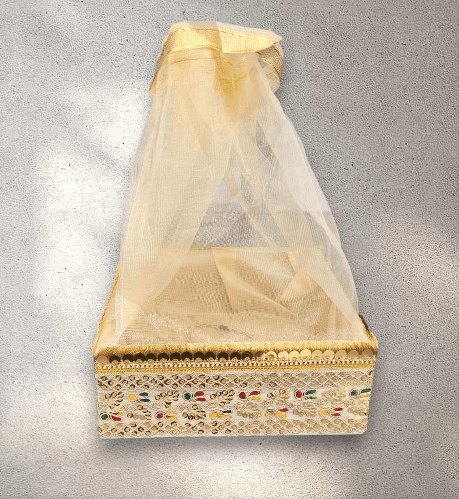 This beautifully crafted decorative basket features intricate gold embroidery, colourful detailing, and a soft netted fabric that adds an elegant finishing touch. Perfect for wedding trays, gifting, hampers, mehndi or hurdee presentations, and festive décor, it brings a luxurious and traditional feel to any occasion. Its sturdy structure and detailed embellishments make it ideal for presenting sweets, dry fruits, cosmetics, accessories, or return gifts in a refined and memorable way. A stylish and versatile addition to any celebration.