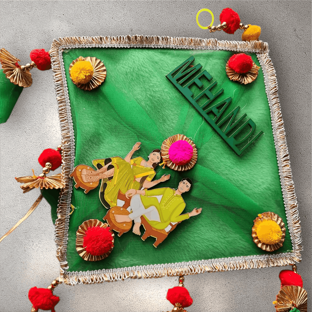 This Mehndi hanging piece brings a bold and elegant touch to your celebration setup. The rich green centre, paired with a striking gold frame and tassel detailing, creates a vibrant statement that beautifully complements traditional Mehndi colours. Perfect for doorways, backdrops or decor accents, it adds a festive charm and instantly elevates the atmosphere of your event.