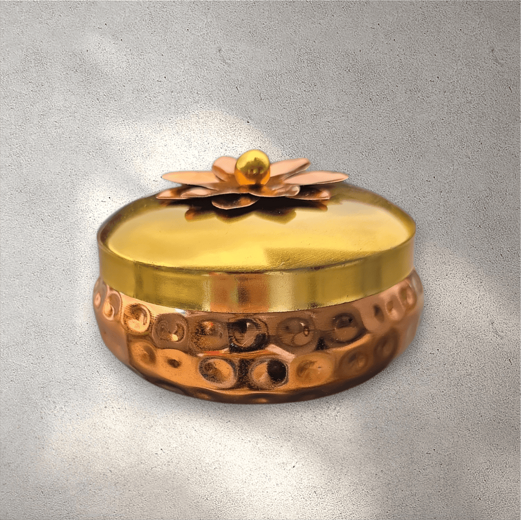 Beautiful metal dabba in a copper and brass colour - ideal for storage or wedding trays