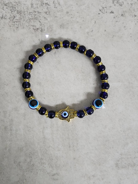 This Evil Eye bracelet contains plastic evil eye beads and navy blue glass beads