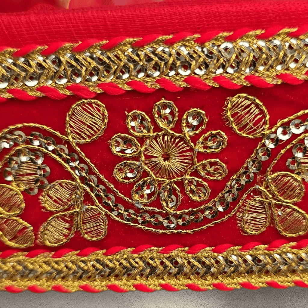 This beautifully crafted decorative basket features intricate gold embroidery, colourful detailing, and a soft netted fabric that adds an elegant finishing touch. Perfect for wedding trays, gifting, hampers, mehndi or hurdee presentations, and festive décor, it brings a luxurious and traditional feel to any occasion. Its sturdy structure and detailed embellishments make it ideal for presenting sweets, dry fruits, cosmetics, accessories, or return gifts in a refined and memorable way. A stylish and versatile addition to any celebration.