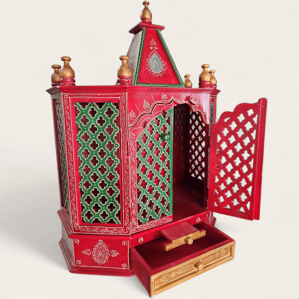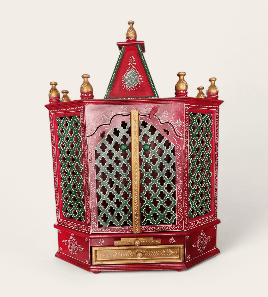 Beautiful prayer place ideal for smaller homes and apartments. This mandhir can be mounted to your wall or can be placed on top of a table, etc. This mandhir also has a convenient drawer to store your prayer essentials. This also comes with Free Delivery!