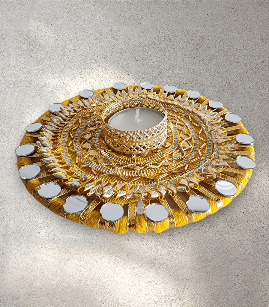 Yellow decorative tealight holder ideal for wedding/hurdhee decor purposes. Comes with a tealight