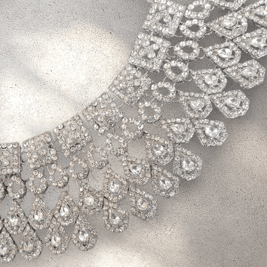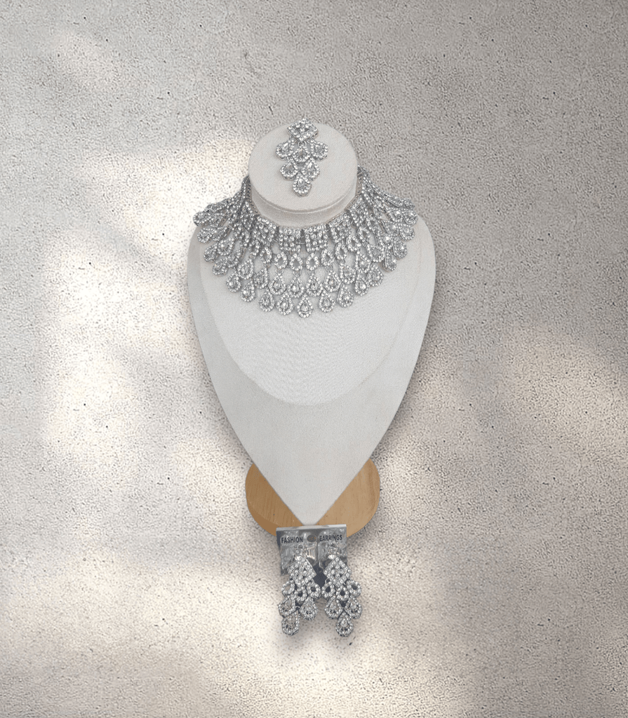 This beautiful, handmade, dress jewellery set includes a necklace, drop earrings and a sirbandi (hair accessory). The jewellery set is studded with high quality stones.