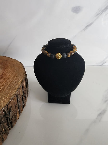 This bracelet contains the Tigers eye gemstone, lavastone a and Lion charm.