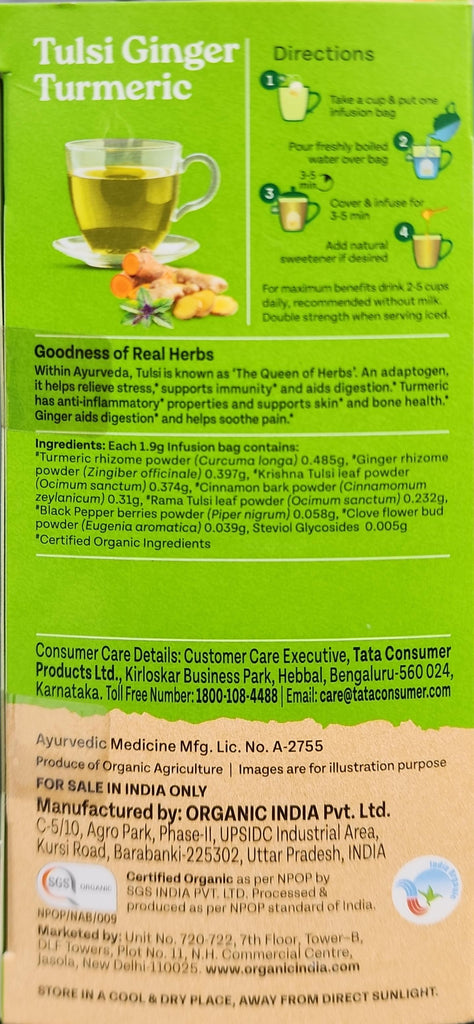 This Tulsi Ginger Turmeric herbal infusion from Organic India offers a comforting and wellness-focused blend made from certified organic ingredients. Combining the healing properties of tulsi with the warmth of ginger and turmeric, it supports stress relief, digestion, and overall vitality. Naturally caffeine free and crafted for daily balance, it is perfect for moments of calm at home or work. Each box contains 25 individually sealed teabags, providing convenience, freshness, and the ideal choice for anyone seeking a soothing, holistic brew.