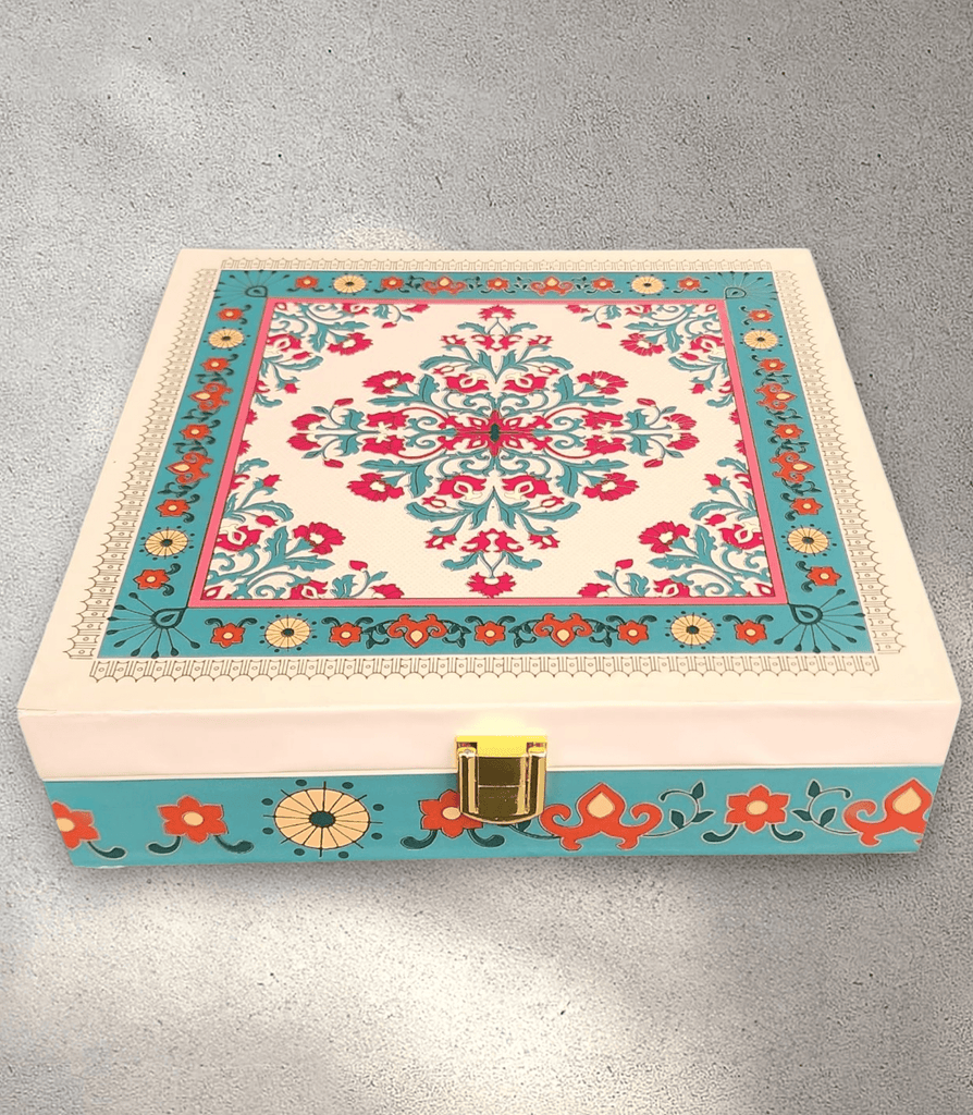 A beautifully designed wooden box that blends function with elegance. Its sturdy build, soft interior lining and spacious four-section layout make it perfect for organising jewellery, gifting sweets, storing trousseau items or presenting hampers in a refined way. The vibrant floral detailing around the exterior adds a charming touch, turning this box into a keepsake piece that enhances any occasion.